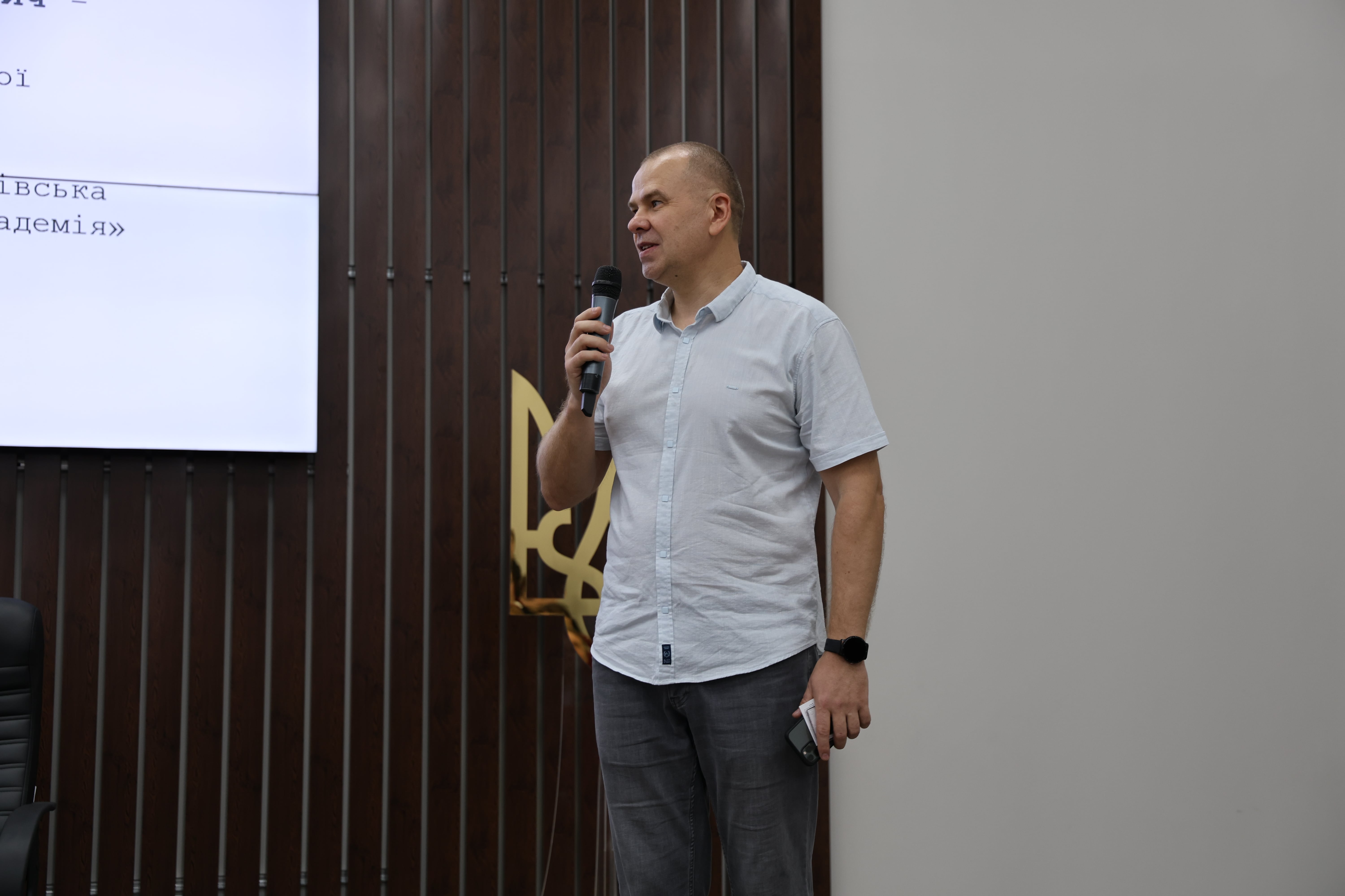 Перед початком викладу Роман Міняйло пригадав особисту історію становлення співпраці з Університетом і знайомство з нині проректором, професором Юрієм Громиком. Потім він поділився досвідом участі своєї кафедри у наукових проєктах та експедиціях.