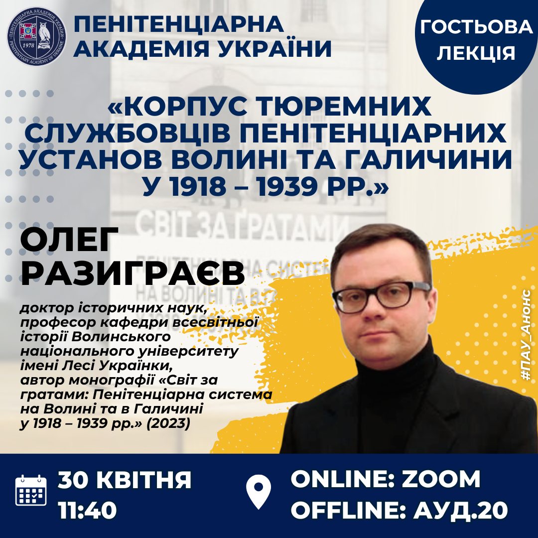 Діяльності більшовицьких диверсійних загонів на теренах міжвоєнної Волині була присвячена гостьова лекція Олега Разиграєва, прочитана 24 квітня для колег Вроцлавського університету у дистанційному режимі на платформі Teams. 30 квітня науковець Лесиного вишу виступив з гостьовою лекцією на тему «Корпус тюремних службовців пенітенціарних установ Волині та Галичини у 1918–1939 рр.» у Пенітенціарній академії України (онлайн).
