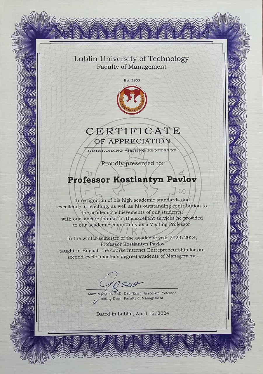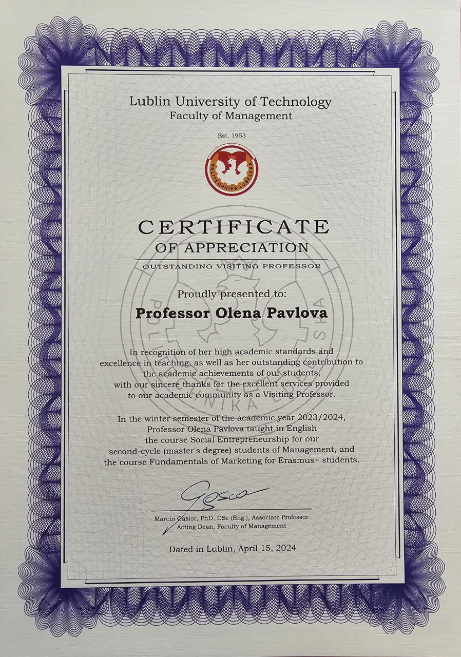 Із приємністю повідомляємо, що доктори економічних наук, професори кафедри економіки і торгівлі Олена та Костянтин Павлови отримали подяки від Marcin Gesior, декана факультету менеджменту Люблінського технологічного університету (Республіка Польща), на знак визнання високих академічних стандартів і досконалості забезпечення процесу викладання іноземною мовою (англійською), а також їхнього високого внеску в академічні досягнення студентів Люблінського технологічного університету в царині «Маркетингу», «Соціального» й «Інтернет-підприємництва».