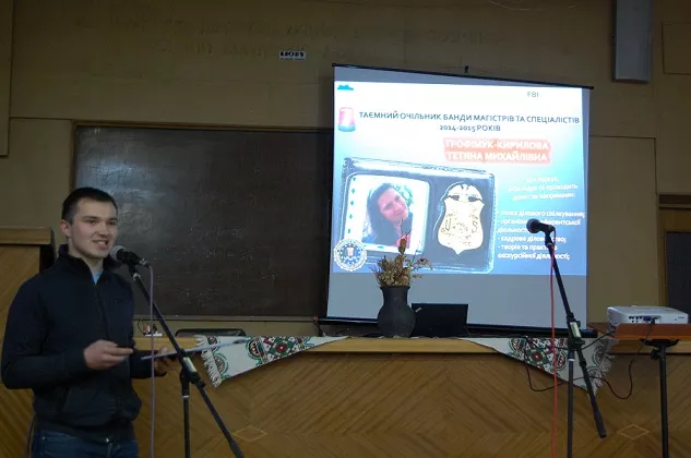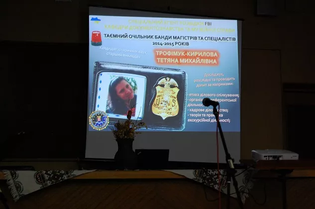 Староста 57 гр. Андрій доповів про таємну організацію – FBI, що діє на кафедрі. Агентами організації є викладачі кафедри документознавства і музейної справи, а очолює FBI доктор історичних наук, професор, завідувач кафедри Світлана Гаврилюк. Доповідач детально розповів, за якими напрямами спецагенти проводять розслідування, дослідження та вчиняють допити.