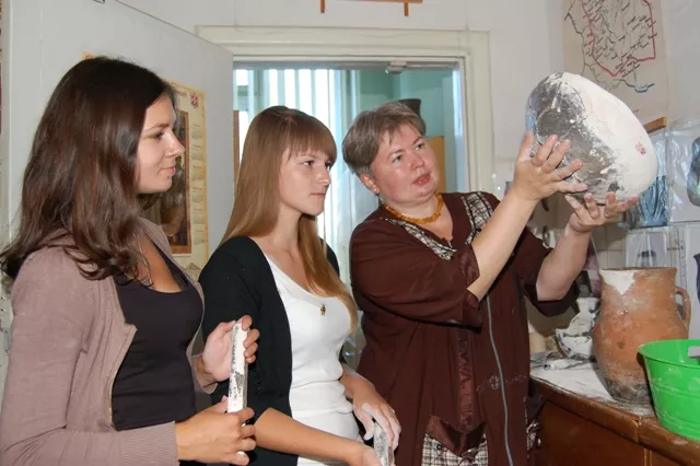 На фото завідувач музею Зоряна Кучинко показує студентам, як реставруються горщики