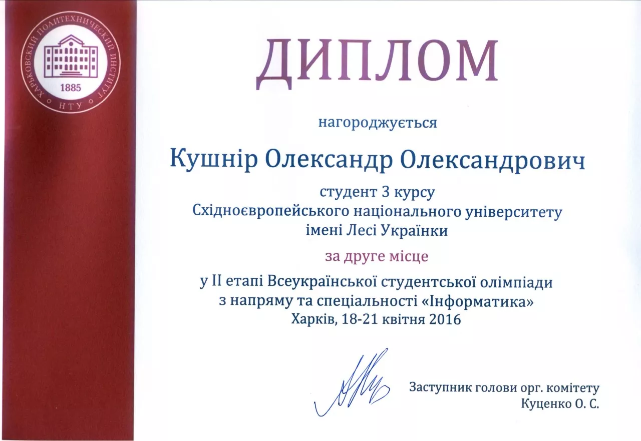 18–21 квітня на базі Національного технічного університету «Харківський політехнічний інститут» відбувся ІІ етап Усеукраїнської студентської олімпіади з напряму та спеціальності «Інформатика». В інтелектуальному змаганні взяли участь 57 учасників із вищих навчальних закладів України, які здійснюють підготовку фахівців з інформатики. Східноєвропейський національний університет імені Лесі Українки представляли студенти факультету інформаційних систем, фізики та математики спеціальності «Інформатика»  Олександр Кушнір (ІІІ курс) та Андрій Хом’як (ІV курс) .