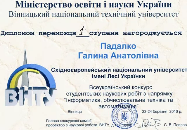Нещодавно Галина також була нагороджена дипломом І-го ступеня на Всеукраїнському конкурсі студентських наукових робіт із напряму «Інформатика, обчислювальна техніка та автоматизація» (Вінницький національний технічний університет, 22–24 березня 2016 р.)