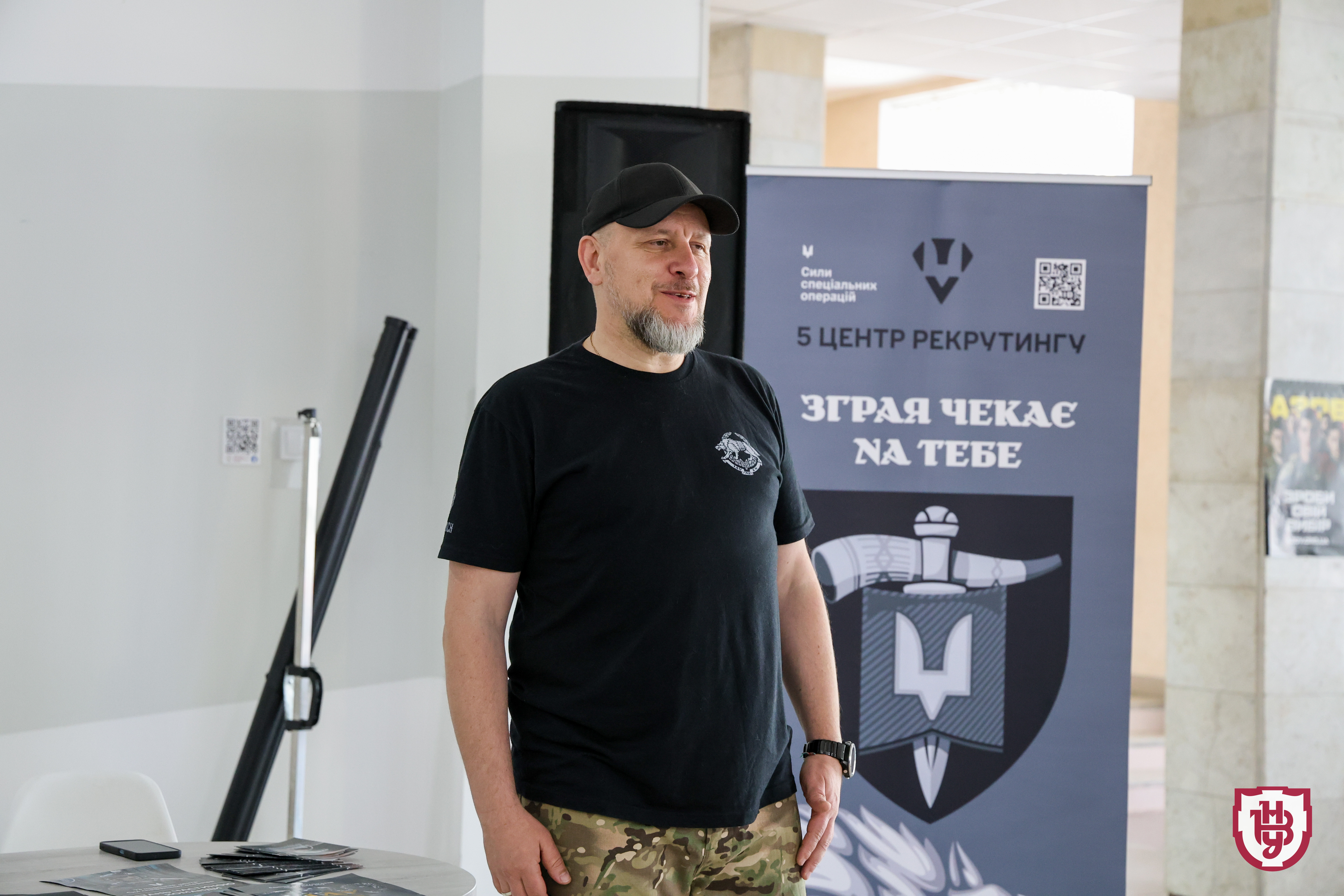 Разом із побратимом «Китом» військові відповідали на запитання студентів. Йшлося не лише про бойові операції, а й про психологічну витримку, втрати, роботу в тилу, критерії відбору до ССО.