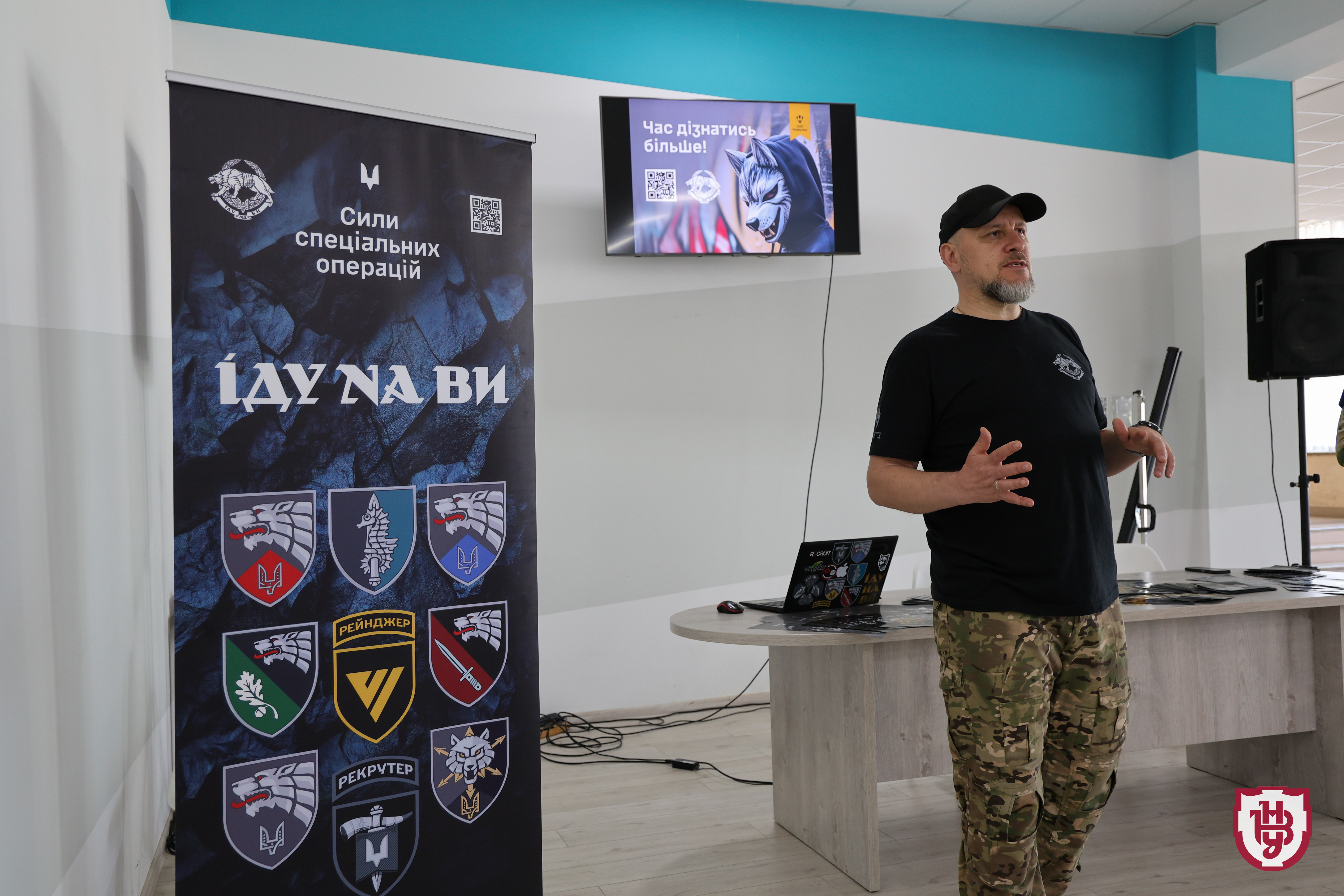 До здобувачів освіти завітав рекрутер Сил спеціальних операцій ЗСУ Віктор Шевченко, боєць із позивним «Шрек» і боєць із позивним «Кит». Вони розповіли про одну з наймолодших і водночас найтехнологічніших складових частин українського війська – ССО. Там служать лише найкращі: фізично загартовані, ментально стійкі, з чіткою мотивацією боротися за Україну. Військові також розповіли про функції, які виконує кожен підрозділ, відбір кандидатів на військову службу, труднощі, які можуть виникнути в охочих на шляху до омріяного місця в ССО, та що чекає на відібраних кандидатів далі.