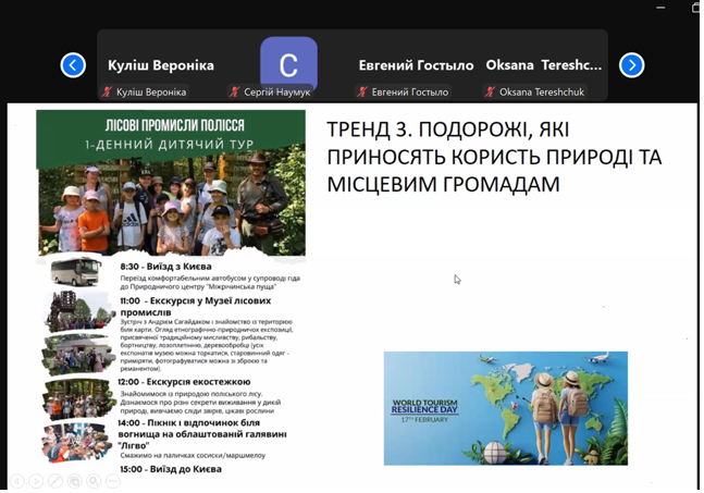 У межах вивчення ОК «Інноваційні технології в туризмі», яку забезпечує доцент Тетяна Лисюк, і «Ринок туристичних послуг», яку забезпечує доцент Оксана Терещук, здобувачі другого (магістерського) рівня вищої освіти галузі знань 24 Сфера обслуговування спеціальності 242 Туризм та рекреація освітньо-професійної програми «Туризм» взяли участь в онлайн-вебінарі «Сучасні тренди в туризмі: як адаптуватися до змін?».
