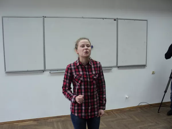 Одразу налаштувавши допитливу студентську аудиторію не на лекцію, а на діалог, гостя запросила студентів подумати, ким і де була б Леся Українка нині, якби жила в сучасній нам Україні. На глибоке переконання пані Світлани, Поетеса в наш час перебувала б у АТО, на передовій, ведучи за собою своїм палким словом-зброєю. І розмірковуючи над феноменом Лесі, дійшла цікавого висновку, що саме такими виховує людей наша волинська земля (при цьому журналістка навела ще один яскравий приклад самовідданого служіння Україні, її культурі та освіті – засновницю Київської братської школи Галшку Гулевичівну). Запитавши ж присутніх, ким для них є Леся Українка, отримала найрізноманітніші відповіді – «ідеал Жінки», «титан», «взірець любові до народу», «творець власної долі» та ін. Яскравими ілюстраціями до розмови стали поезії Лесі Українки, які прозвучали у виконанні як самої Світлани Рижук, так і студенток ФфтаЖу Наталії Марчук, Анни Соколової, Анни Єлізар’євої (до речі, обидві Анни – лауреати конкурсу читців творів Лесі Українки). Власний вірш прочитала Анастасія Кушнарьова.