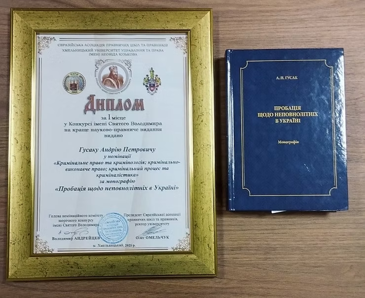 У номінація «Кримінальне право і кримінологія; кримінально-виконавче право; кримінальний процес та криміналістика»: перше місце присуджено Гусаку Андрію Петровичу за монографію «Пробація щодо неповнолітніх в Україні».