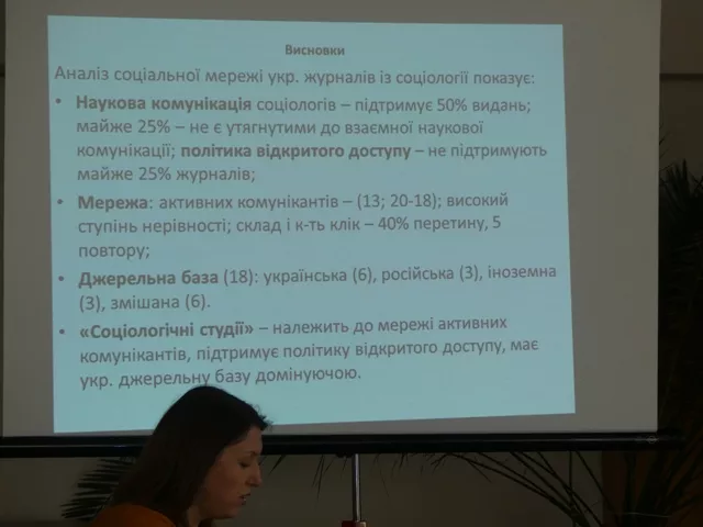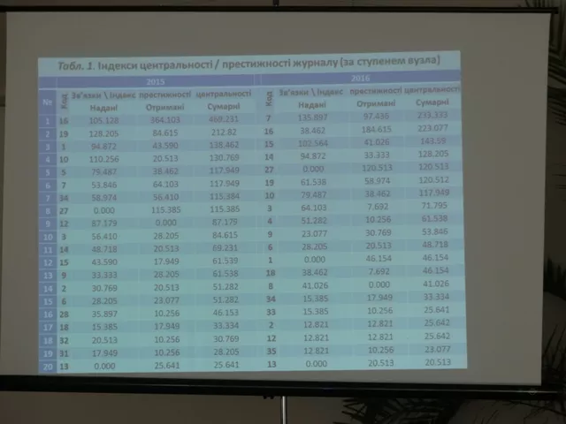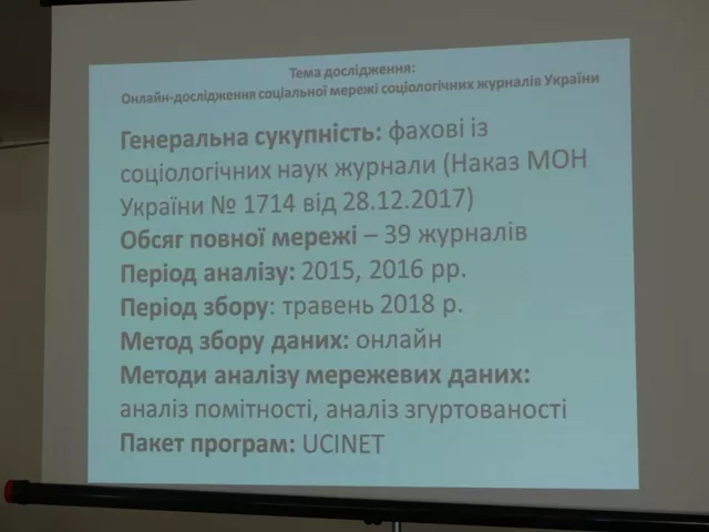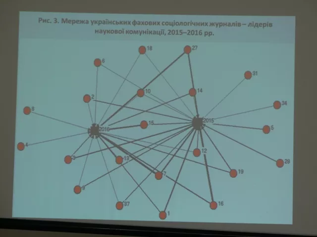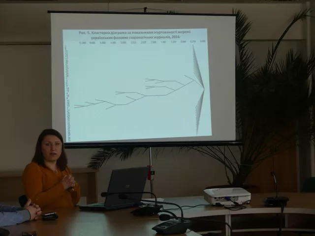Як зазначила пані Світлана, генеральну сукупність дослідження становили 39 фахових журналів із соціологічних наук (наказ МОН України № 1714 від 28.12.2017 р.). Період аналізу – 2015–2016 рр., збір інформації відбувся в травні 2018 р. Були використані методи аналізу мережевих даних, як-от: аналіз помітності, аналіз згуртованості у пакеті програм UCINET.