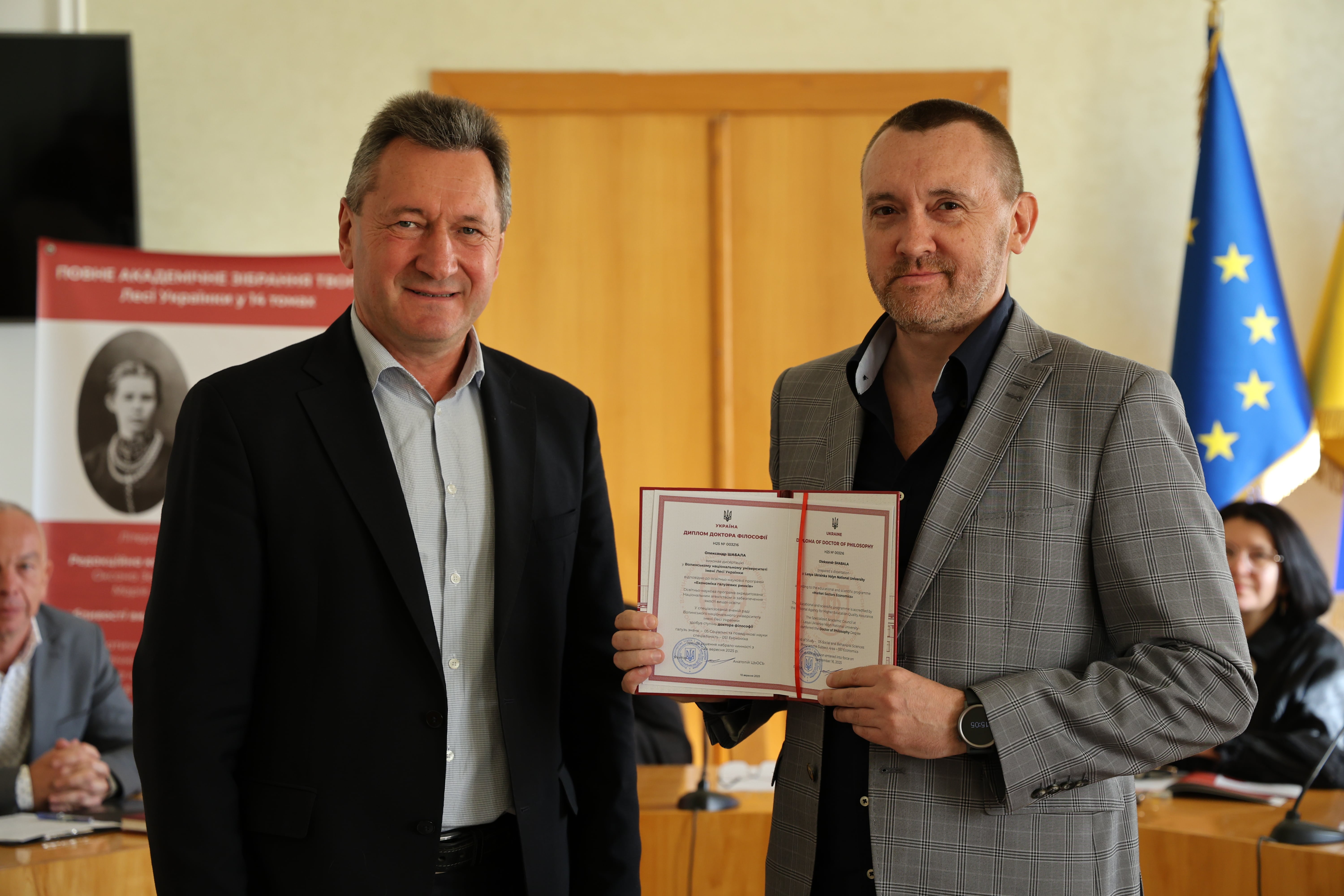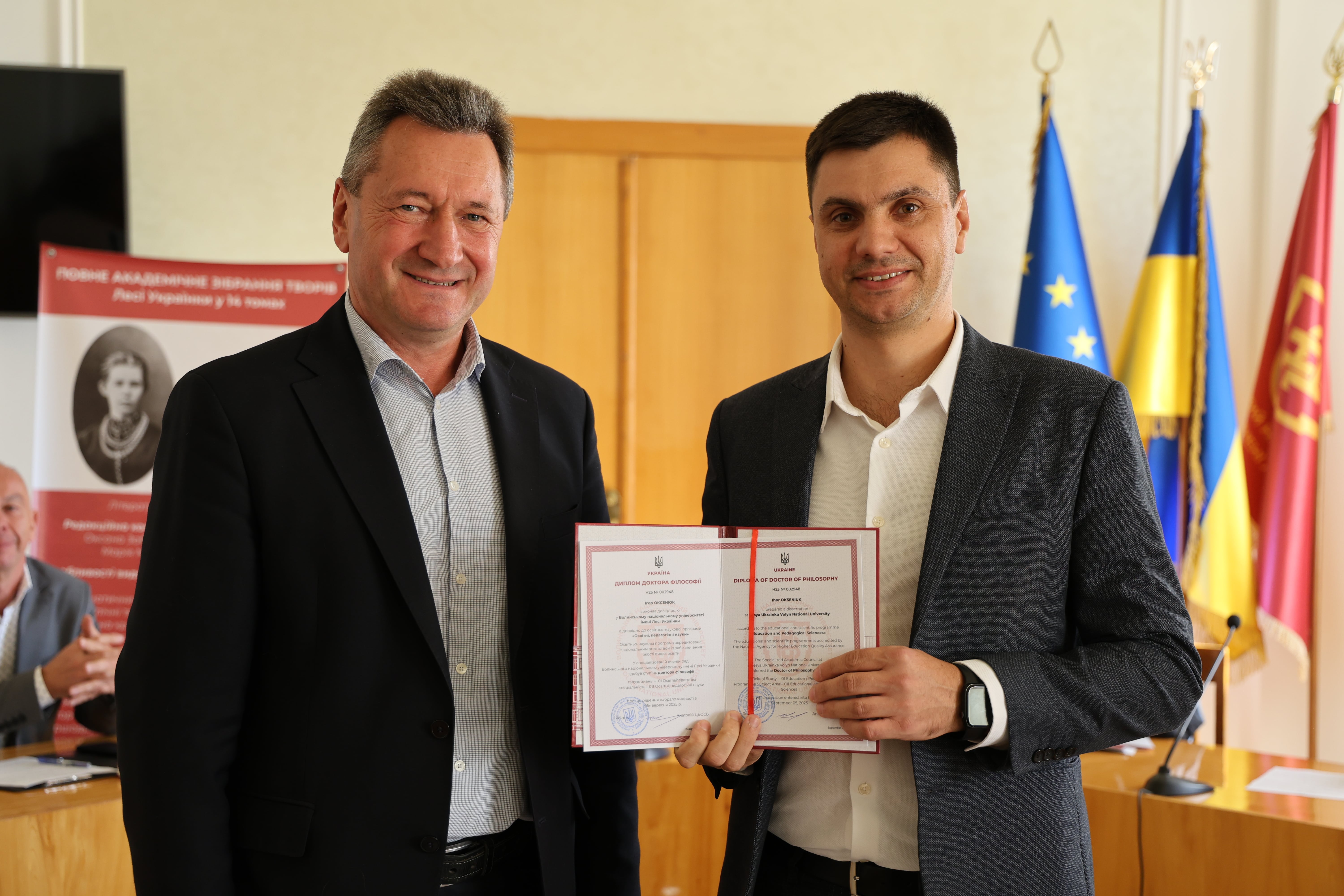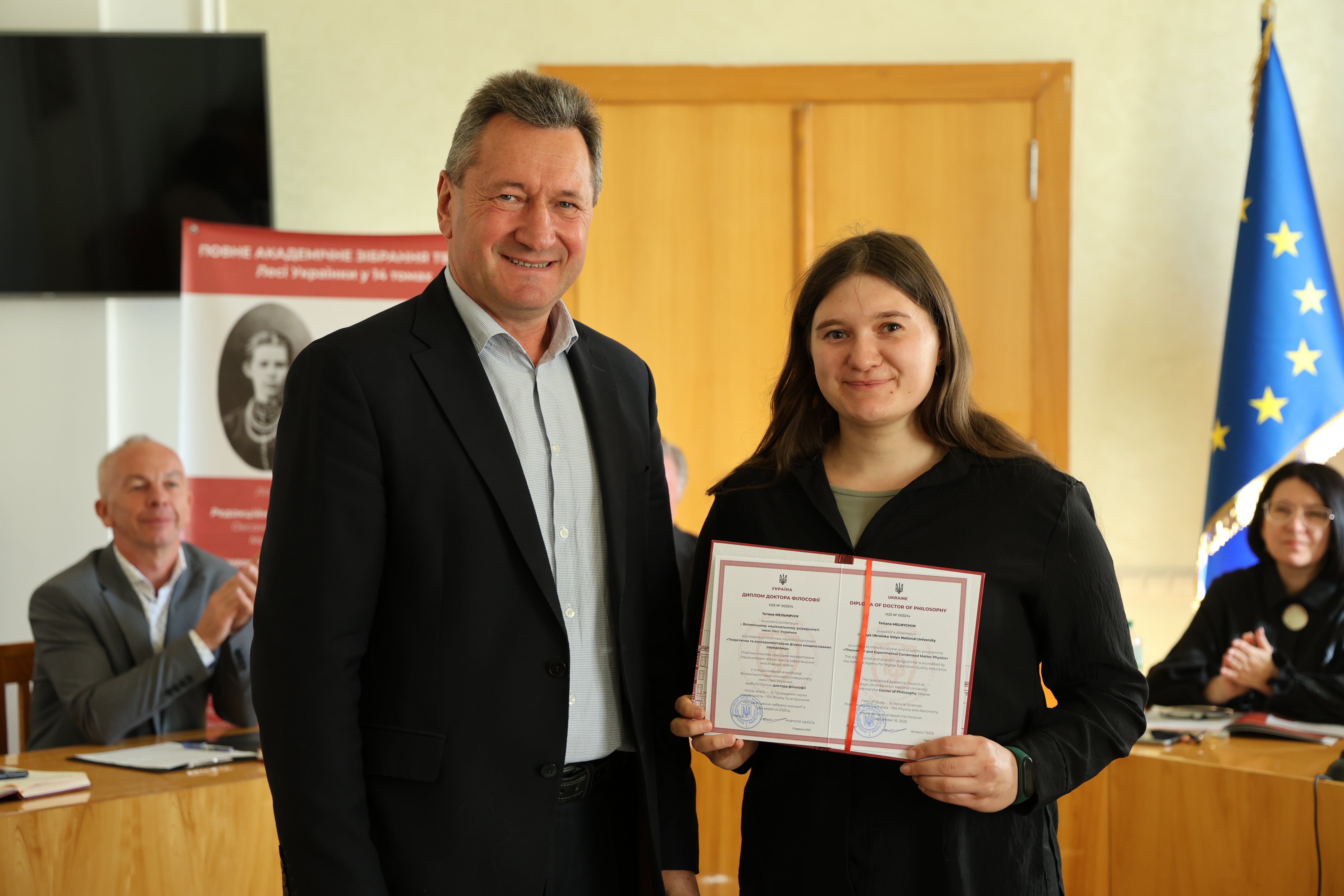 Дипломи вручив ректор Університету, професор Анатолій Цьось, який привітав новоспечених докторів філософії з успішним захистом дисертаційних досліджень.
