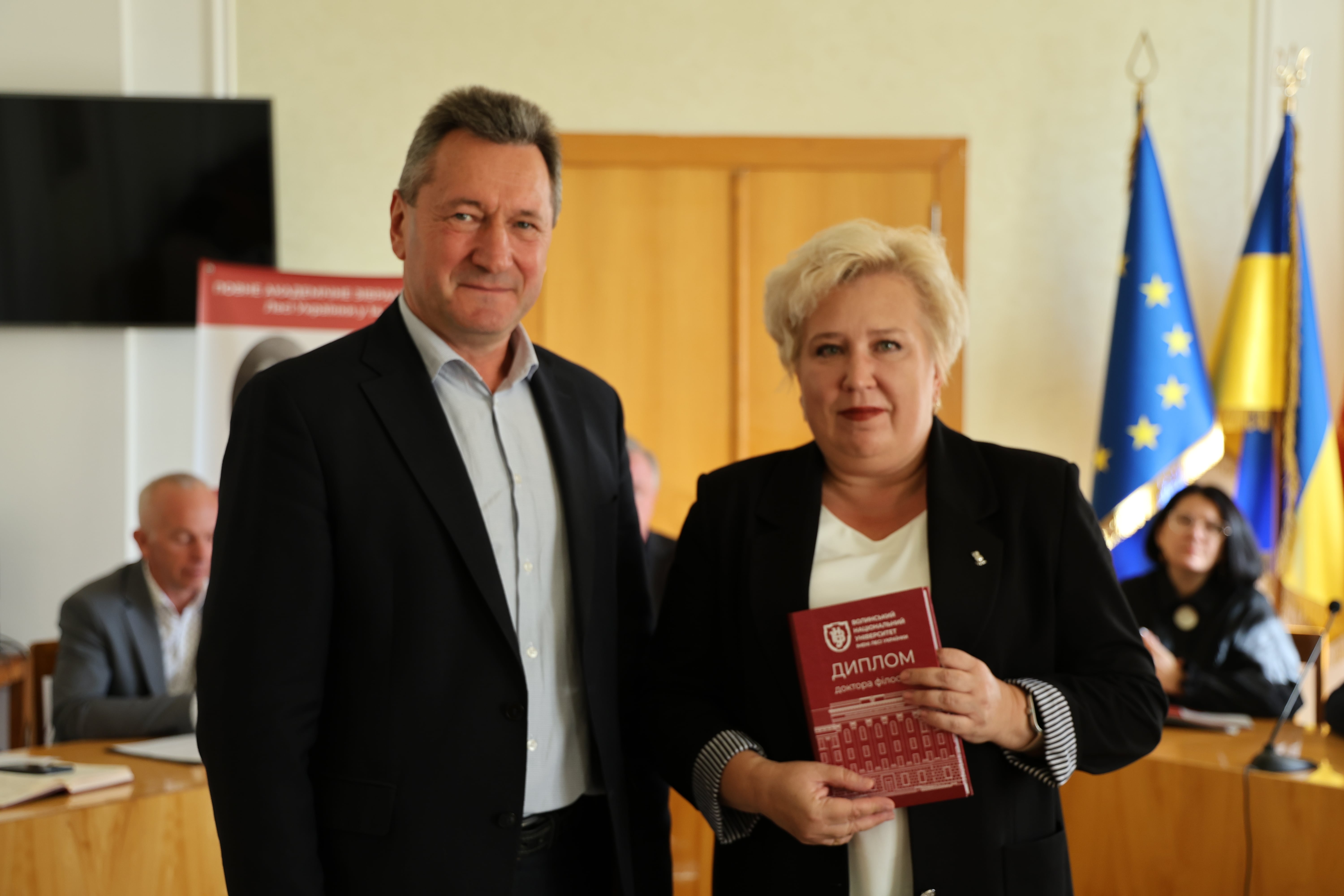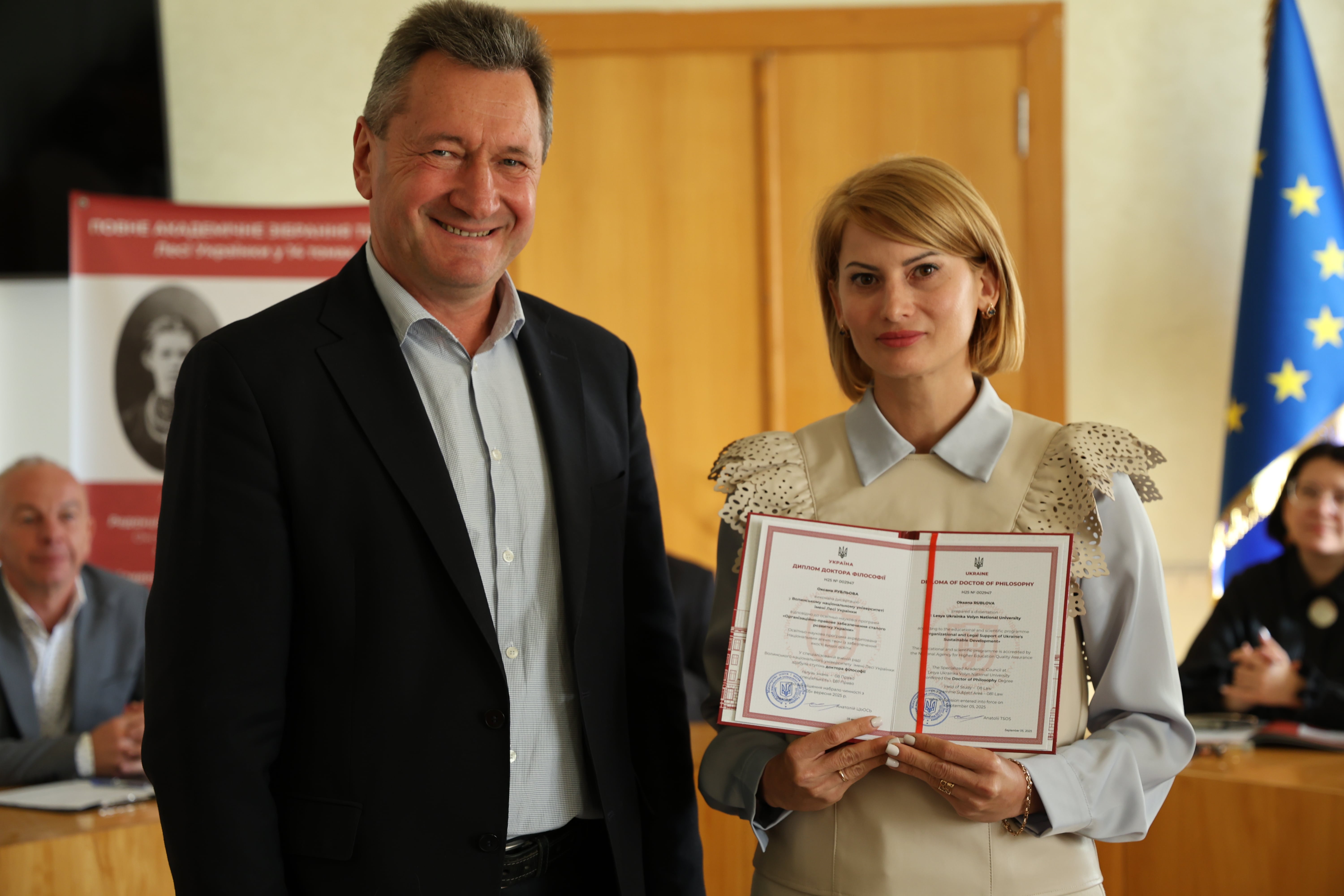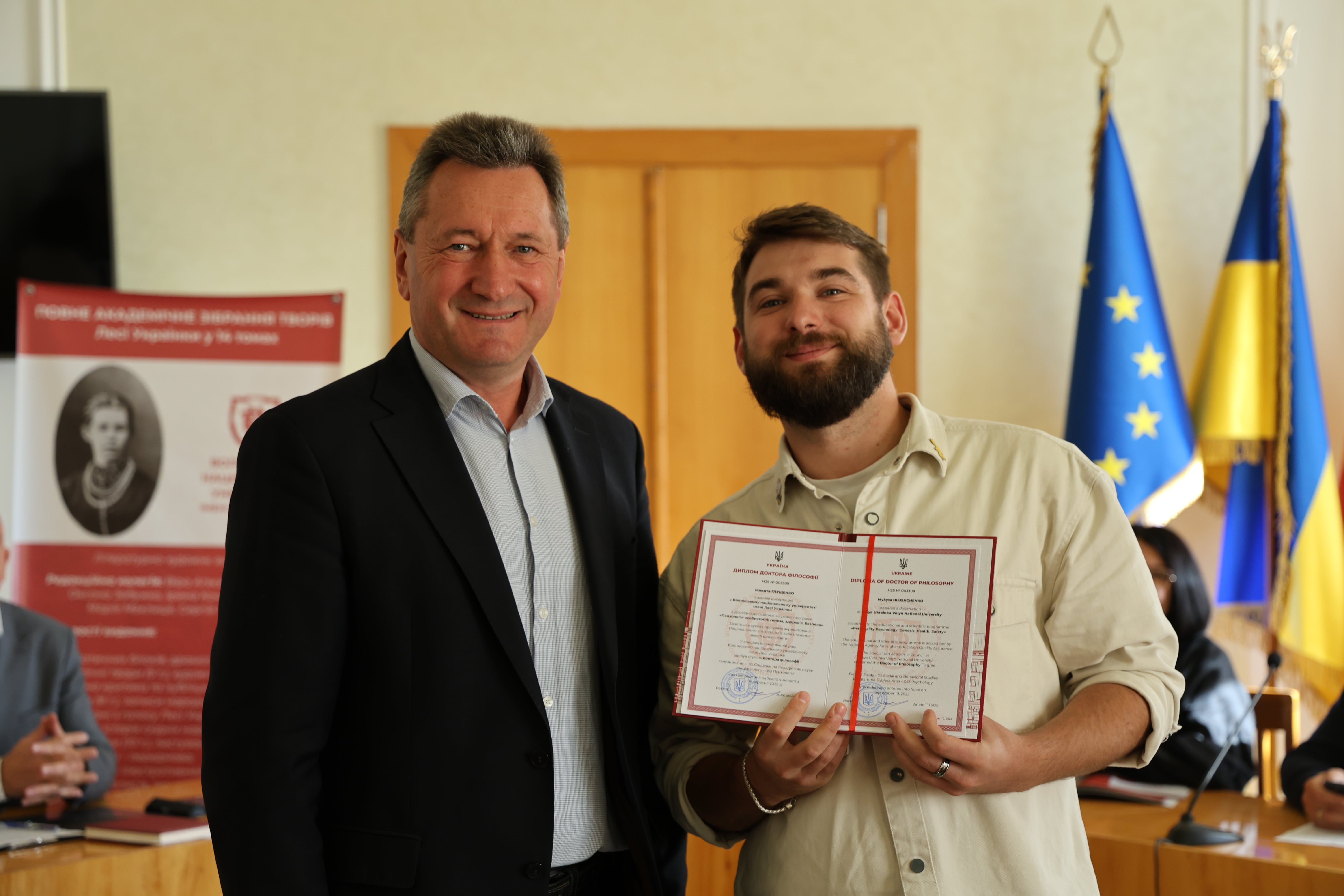 Дипломи вручив ректор Університету, професор Анатолій Цьось, який привітав новоспечених докторів філософії з успішним захистом дисертаційних досліджень.
