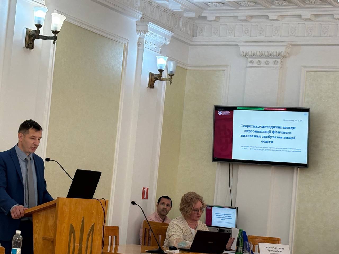 Свою наукову роботу на тему «Теоретико-методичні засади персоналізації фізичного виховання здобувачів вищої освіти» на розгляд спеціалізованої вченої ради презентував Банах Володимир Ігорович з метою присудження йому наукового ступеня доктора наук зі спеціальності 24.00.02 – фізична культура, фізичне виховання різних груп населення.