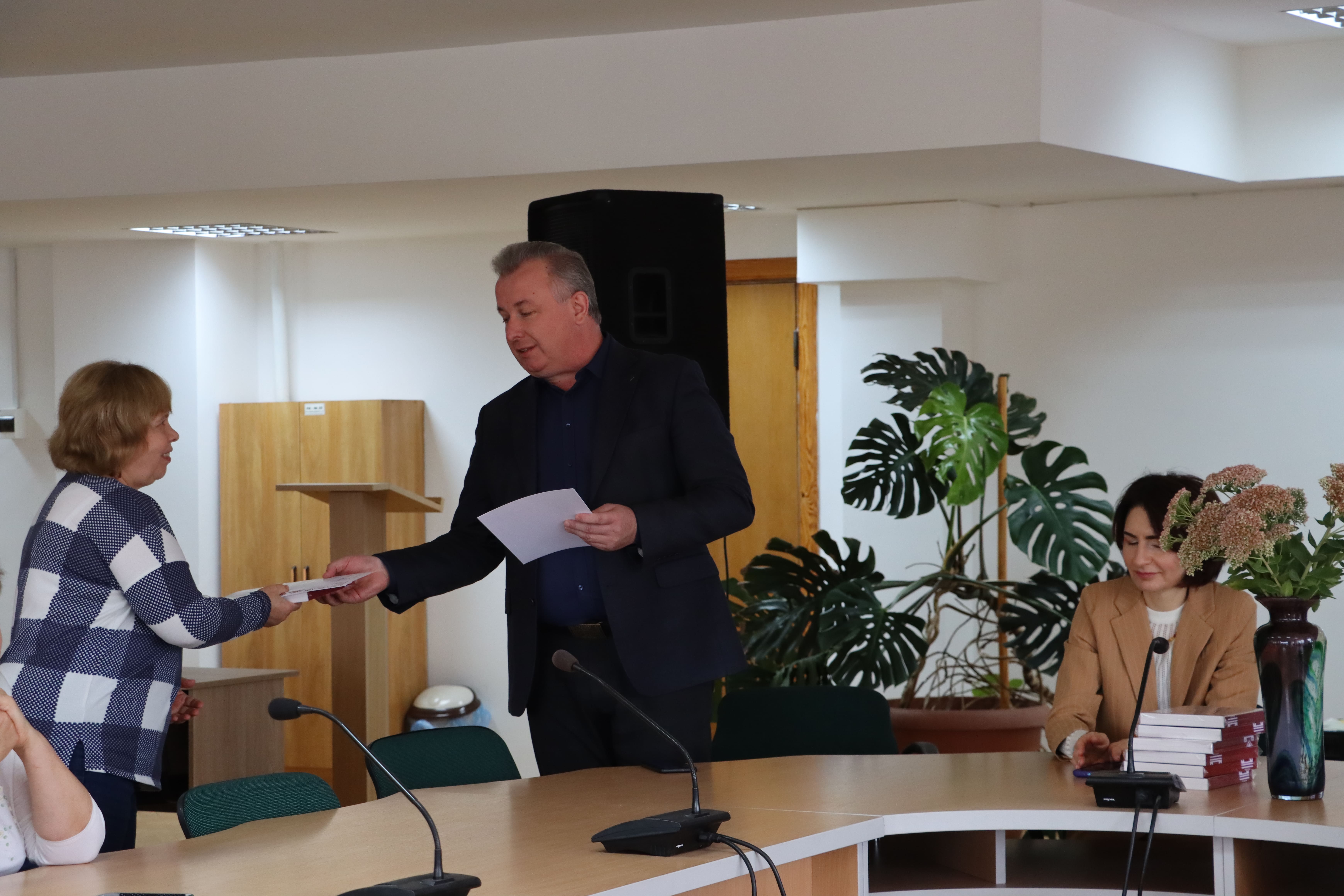 На початку слово взяла в. о. директора бібліотеки Оксана Петрик. «Професія бібліотекаря цікава і непроста. Я навіть не думала, що працюватиму в бібліотеці, але на сьогодні я вже двадцять років тут», – резюмувала вона. Також Оксана Петрик згадала і про очільника бібліотеки Володимира Собчука, який у лавах ЗСУ боронить нашу незалежність.