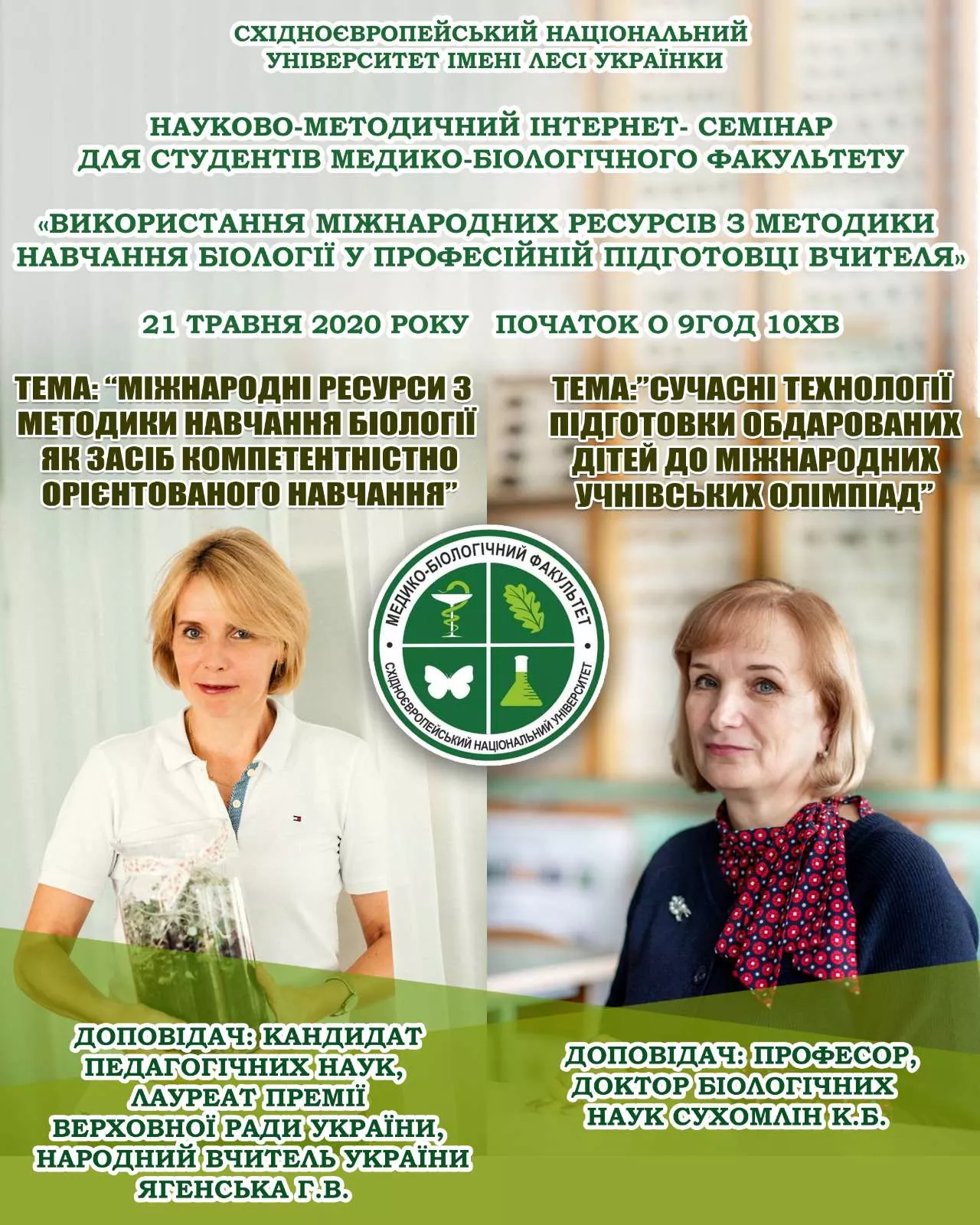 На медико-біологічному факультеті 21 травня о 9:10 відбудеться науково-методичний інтернет-семінар для студентів медико-біологічного факультету й усіх охочих «Використання міжнародних ресурсів з методики навчання біології у професійній підготовці вчителя».