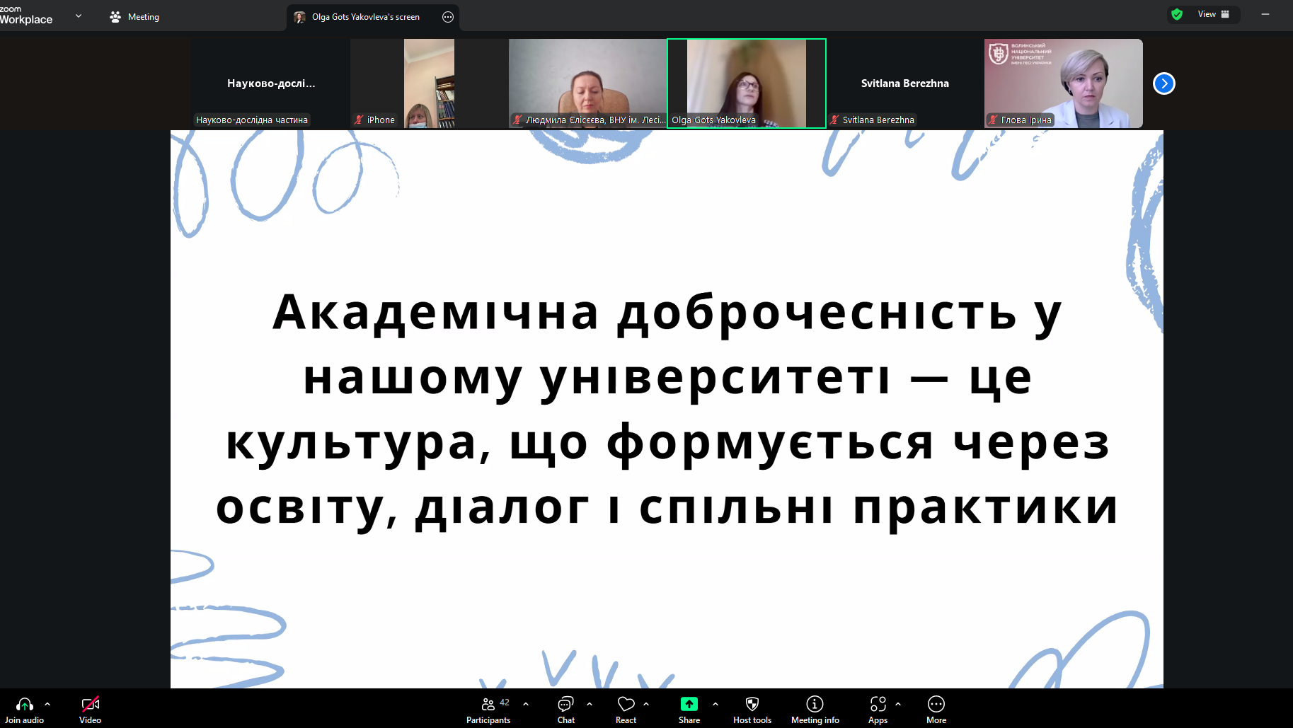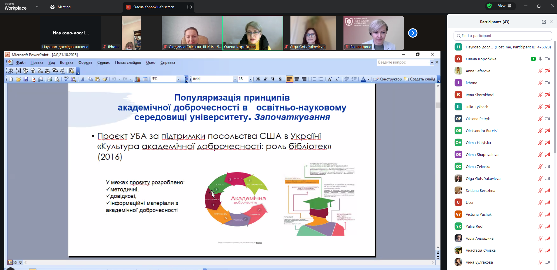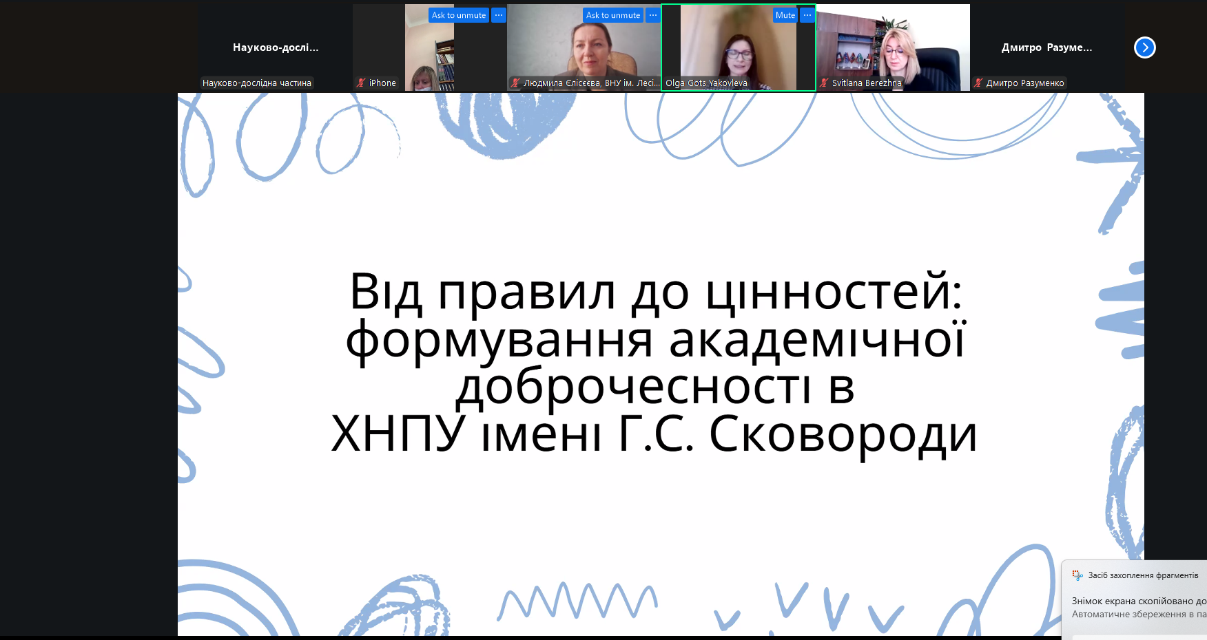 1) Академічна доброчесність як спільна цінність: міжуніверситетський обмін практиками (досвід Волинського національного університету імені Лесі Українки та Харківського національного педагогічного університету імені Григорія Сковороди). Захід зібрав близько 50 представників з обох університетів і став платформою для обміну досвідом та продуктивного діалогу. Розпочалася зустріч з вітальних слів Людмили Єлісєєвої – модераторки заходу, проректорки з науково-педагогічної роботи та міжнародної співпраці ВНУ імені Лесі Українки та Світлани Бережної – проректорки з наукової, інноваційної і міжнародної діяльності ХНПУ імені Г.С. Сковороди. Опісля цього учасники мали змогу ознайомитись із досвідом реалізації політики академічної доброчесності в кожному з університетів та обговорити інституційні кейси і кращі практики інтеграції принципів академічної доброчесності в освітньо-наукову діяльність. Окрема увага була зосереджена на ролі і функціях університетської бібліотеки в цьому процесі.