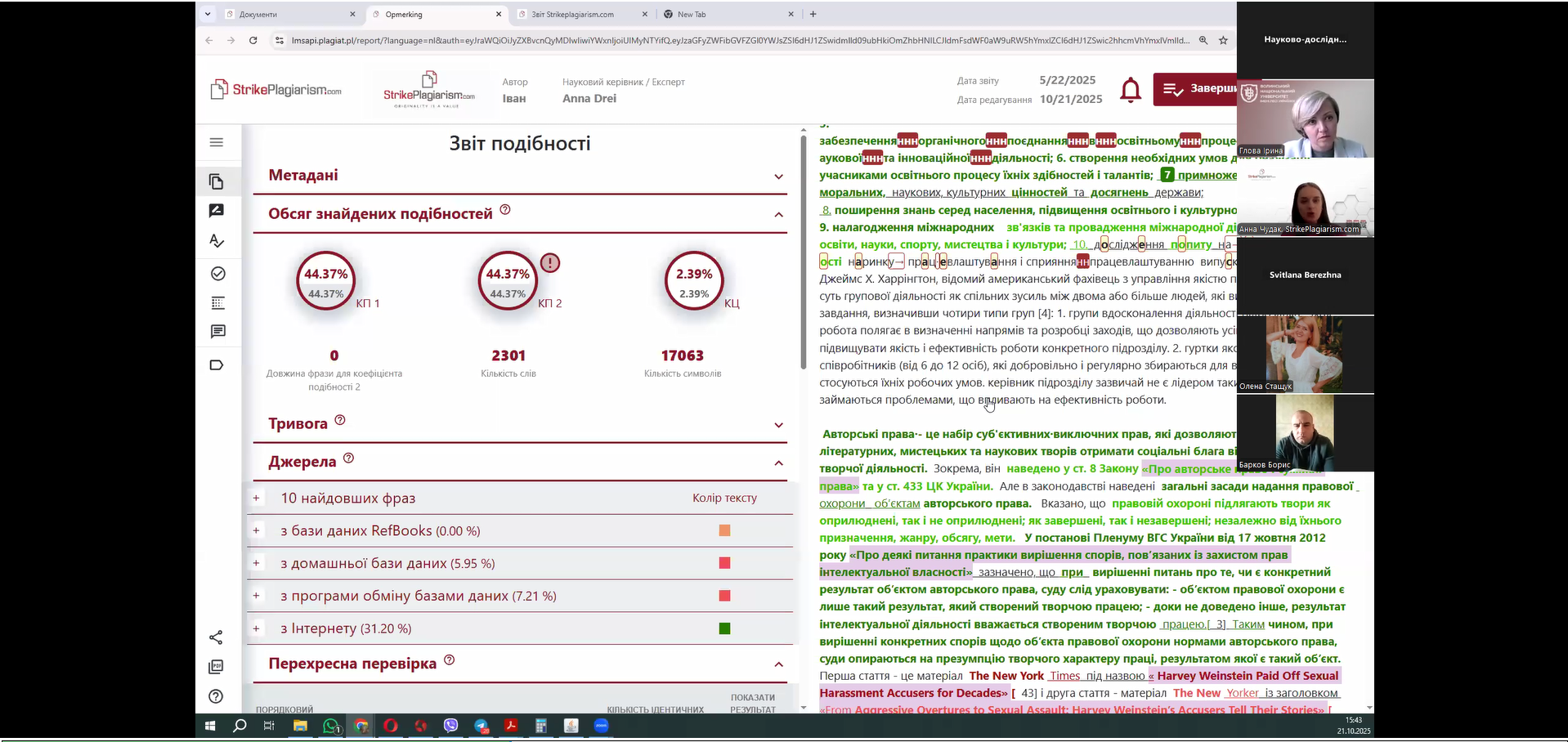 2) Презентація Звіту подібності StrikePlagiarism.com та його функціональні можливості. Модуль виявлення Штучного Інтелекту. Спікер заходу Анна Чудак, менеджерка з розвитку бізнесу StrikePlagiarism.com, презентувала учасникам способи відправлення документів на перевірку на плагіат в системі StrikePlagiarism, нові функціональні можливості звіту подібності та порядок його інтерпретації, додаткові можливості системи (звіт про наявність штучного інтелекту та перевірка текстів на наявність граматичних помилок).