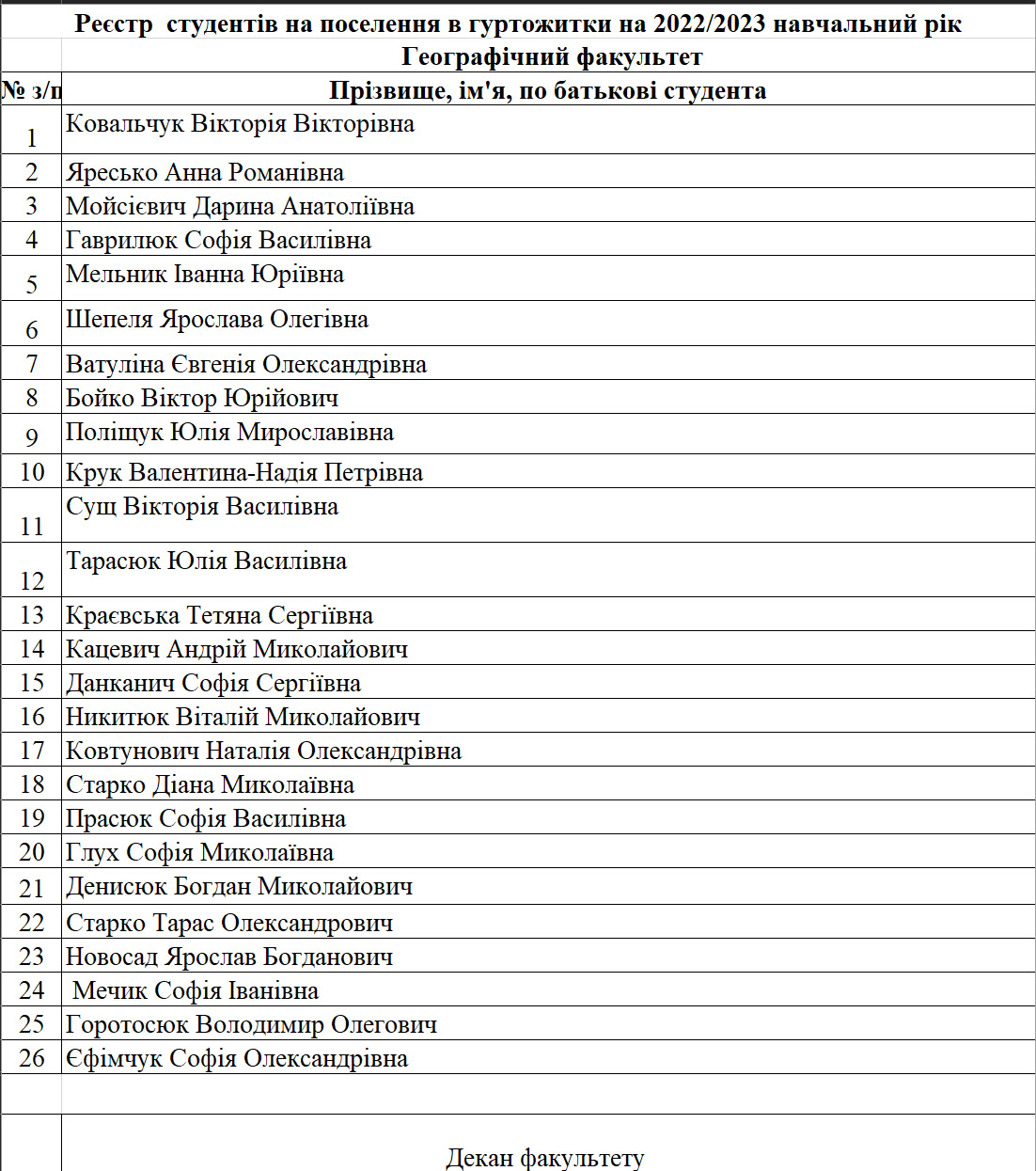 Реєстр студентів  1 курсу географічного факультету, які рекомендовані  на поселення в гуртожиток №2 за адресою: вул. Винниченка 22